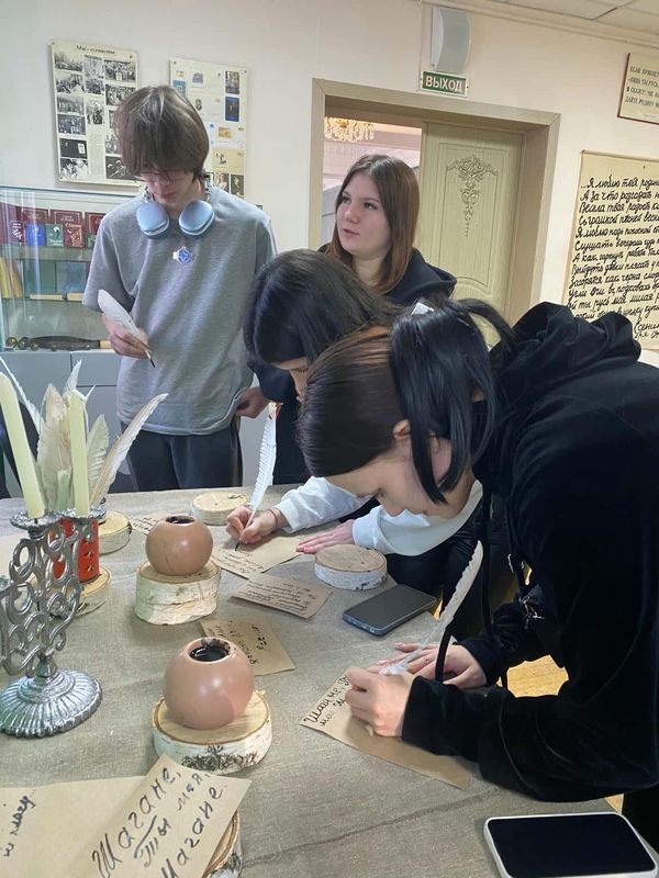 Перед началом мероприятия, под звуки лирических мелодий, гости перенеслись в эпоху Серебряного века, где каждый мог почувствовать себя поэтом, записывая любимые строки Сергея Есенина пером и чернилами.