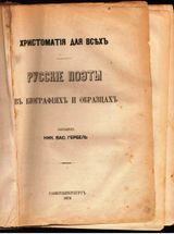Составитель Николай Васильевич Гербель. Русские поэты в биографиях и образцах. Санкт-Петербург, 1873 г., типография Императорской Академии Наук. 664 стр. в твердой тканевой обложке с тиснением. Корешок заменен. На задней обложке с внутренней стороны имеются штампы, надписи.